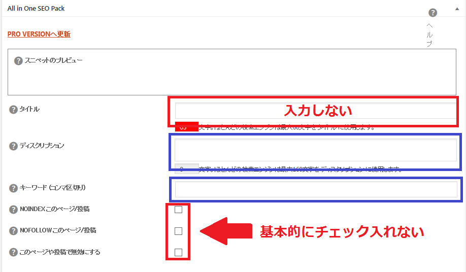 【All in One SEO Pack】を有効化しておくと、記事の投稿画面の下に【All in One SEO Pack】という項目が追加されます。