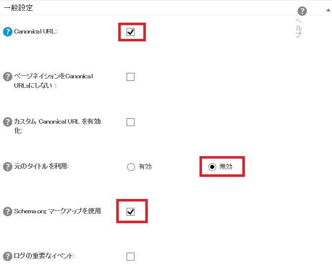 デフォルトでチェックされているのは、【Canonical URL】、【元のタイトルを利用】は「無効」、【Schema.org マークアップを使用】の3つです。