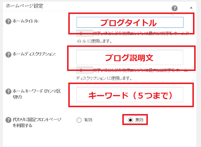 【ホームタイトル】、【ホームディスクリプション】、【ホームキーワード】の3つの項目を入力します。