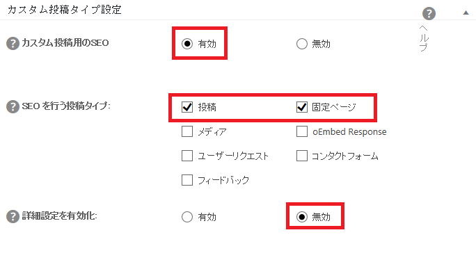 【カスタム投稿用のSEO】が「有効」、【SEOを行う投稿タイプ】が「投稿」と「固定ページ」、【詳細設定を有効化】が「無効」の3つです。