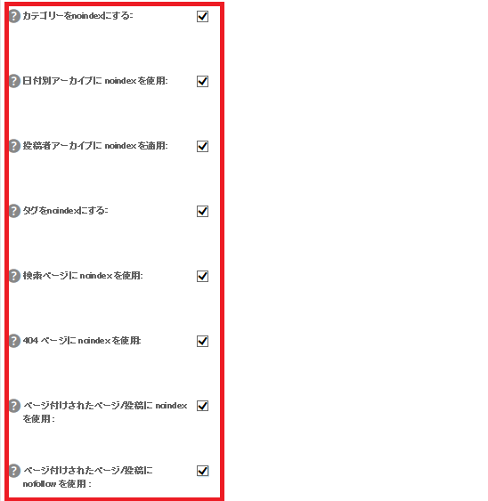 次はその下、【カテゴリーをnoindexにする】から【ページ付けされたページ/投稿にnofollowを使用】までの8つ全てにチェックを入れてください。