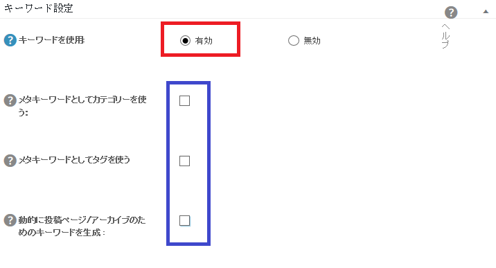 その下にある【メタキーワードとしてカテゴリーを使う】から【動的に投稿ページ/アーカイブのためのキーワードを生成】までの3つの項目はチェックを外しておいてください。