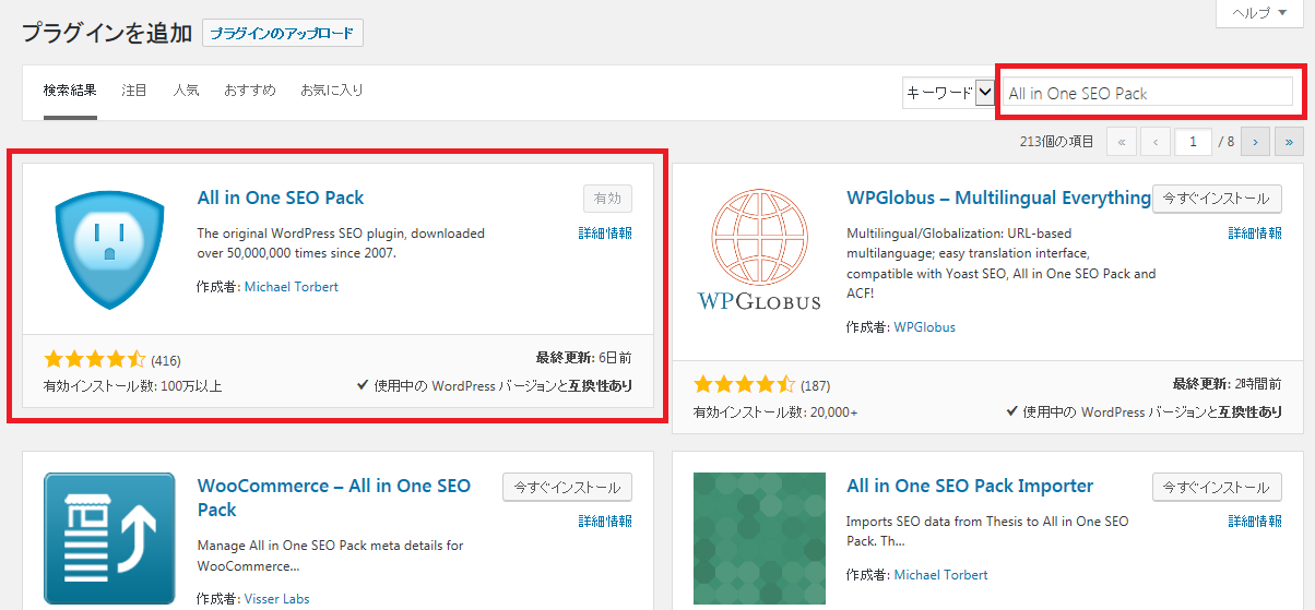 【All in One SEO Pack】が表示されるので、【今すぐインストール】をクリックしてインストールします。