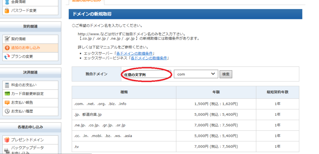次にこのページで、取りたいドメインが利用可能か任意の文字を入れてみましょう。