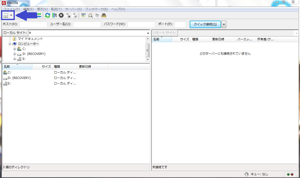 アイコンにカーソルを合わせてダブルクリックで起動しますので、起動したら下図で示している様に、左上のボタンをクリックして【サイトマネージャ】を開きます。