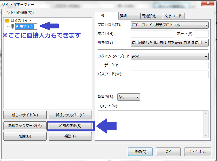 【新規サイト】と書かれている部分をクリックすると文字が青く反転し、そのまま直接名前の変更ができます。
