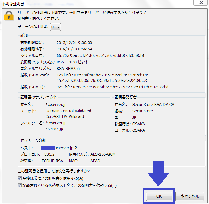 「不明な証明書」信用できるサーバか確認するために注意深く証明書を調べてください