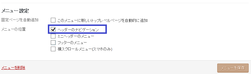 ヘッダーに表示したいなら「ヘッダーのナビゲーション」にチェックを入れ、フッターに表示したいなら「フッターのメニュー」にチェックを入れます。