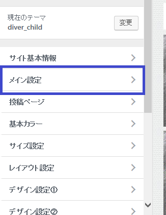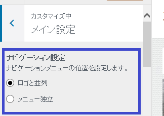 次にカスタマイズ画面で【メイン設定】を選び、【ナビゲーション設定】から「ロゴと並列」か「メニュー独立」か選んでチェックを入れます。