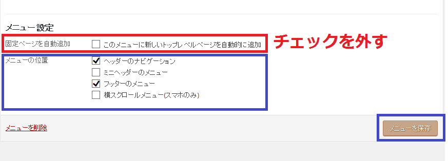 【メニュー設定】の中で、【固定ページを自動追加】はチェックを外しておきましょう。ここにチェックが入っていると、新しく作成した固定ページが自動的にどんどん追加表示されてしまうので、見せる必要の無いページまでグローバルナビに表示されるようになってしまいます。