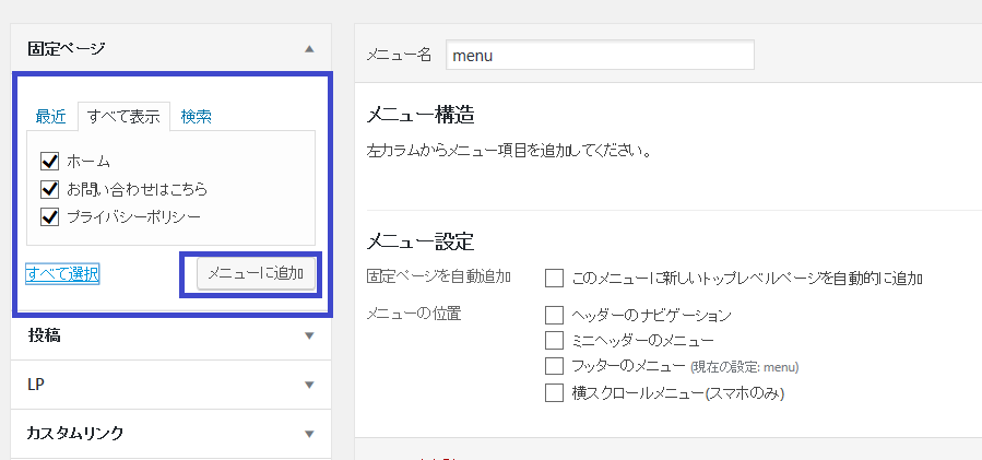 ③.左側のメニューから固定ページやお問い合わせフォーム等、グローバルナビに表示させたいページを選び【メニューに追加】をクリックます。