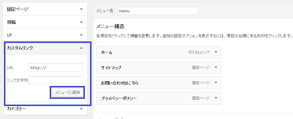 ④.サイトの【ホーム】に戻れるようにしたい場合などは、ホーム画面のURLをコピーしてきて【カスタムリンク】にURLと、表示する文字列を入力して【メニューに追加】をクリックして追加してください。