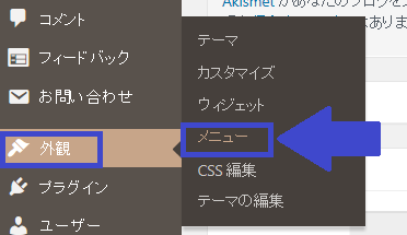 ①.まずWordPressの管理画面【ダッシュボード】から、【外観】→【メニュー】と進みます。