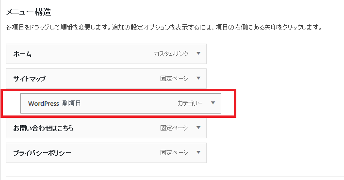 メニュー項目自体が少し右にずれて、【副項目】と表示されたら階層の出来上がりです。