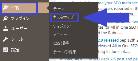 WordPressの管理画面【ダッシュボード】から、【外観】→【カスタマイズ】と進みます。