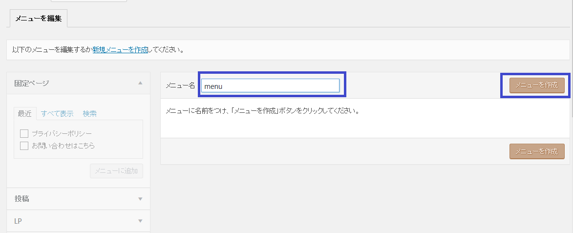 ②.メニュー名に、好きな名前(メニュー名はブログには表示されないので管理しやすい名前)を付けて【メニュー作成】をクリックしてください。