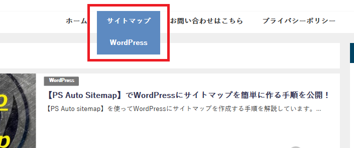 階層とは、簡単に言えばメインメニューに対するサブメニューという感じで、例えば下の画面の様にサイトマップにマウスカーソルを合わせると、その下にWordPressというサブの項目を表示させられる様にできます。