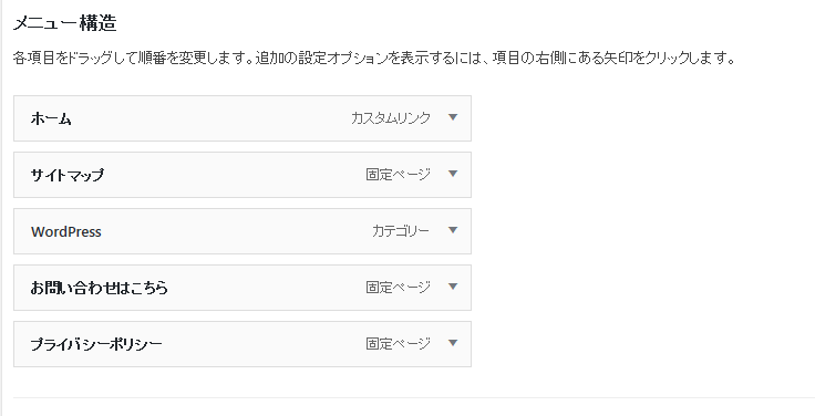 メニューを開き【メニュー構造】で、階層として表示したいメニュー項目をマウスで左クリックしたまま右にずらしてやる(ドラッグ&ドロップ)だけの簡単なお仕事。