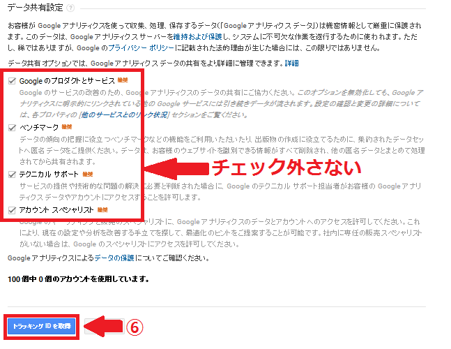 ⑦Googleアナリティクスの利用規約に同意し、トラッキングID、トラッキングコードをコピーしてあなたのブログに設置します。