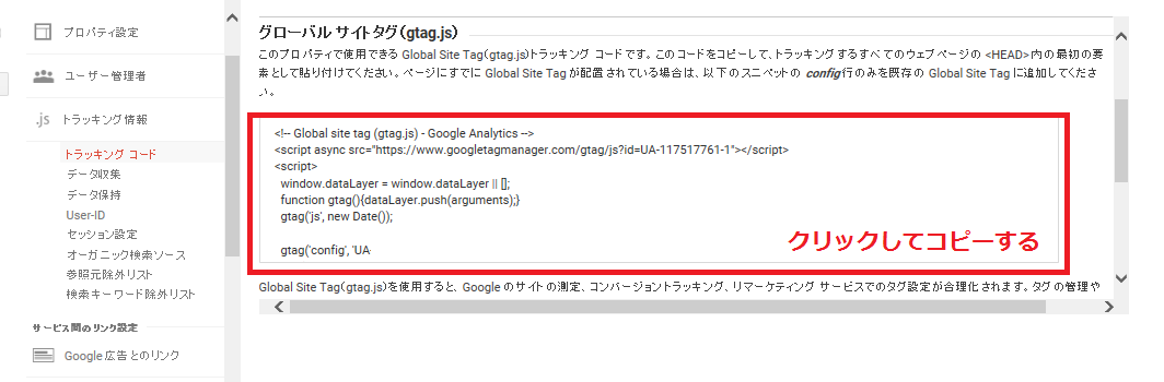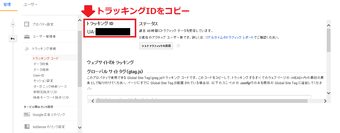 ①Googleアナリティクス管理画面からトラッキングコードをコピーする
