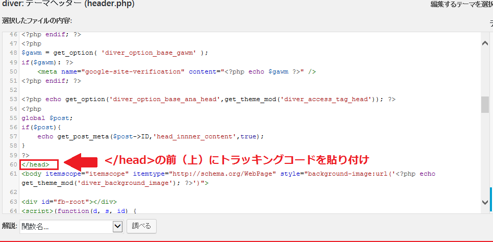 WordPressのダッシュボードから、【外観】→【テーマの編集】→【テーマヘッダー(header.php)】と進み、【</head>】を探してより前にトラッキングコードを貼り付ける。