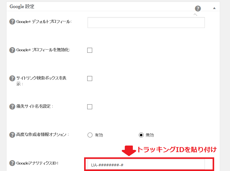 ②【All in One SEO Pack】の設定項目にトラッキングIDを貼り付ける