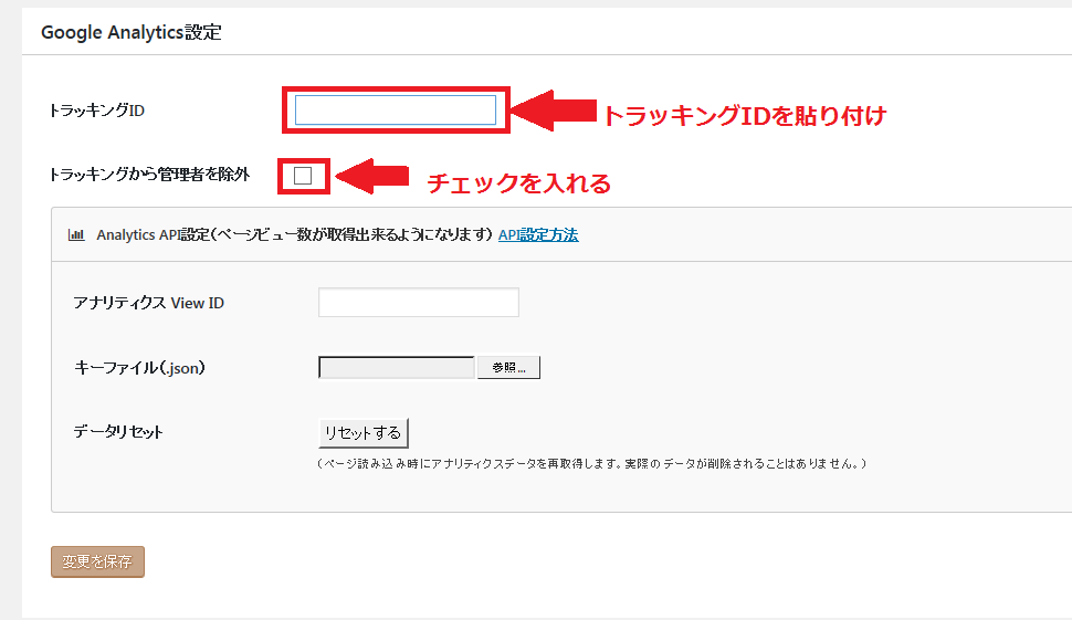 WordPressのダッシュボードにある、【Diverオプション】→【基本設定】→【Google Analytics設定】に進み、トラッキングIDを貼り付け、【変更を保存】する。
