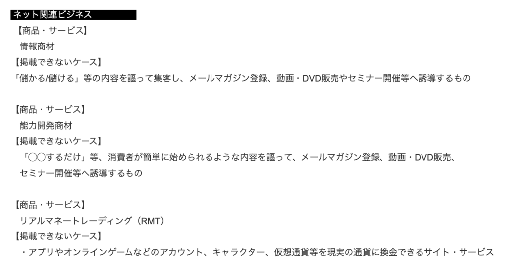 情報商材のセールスや、セミナーへの誘導などは規約違反になります。