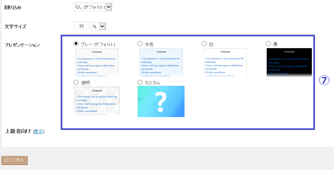 ⑦ 【プレゼンテーション】とは、目次の背景色の事です。ここもお好みで設定してください。