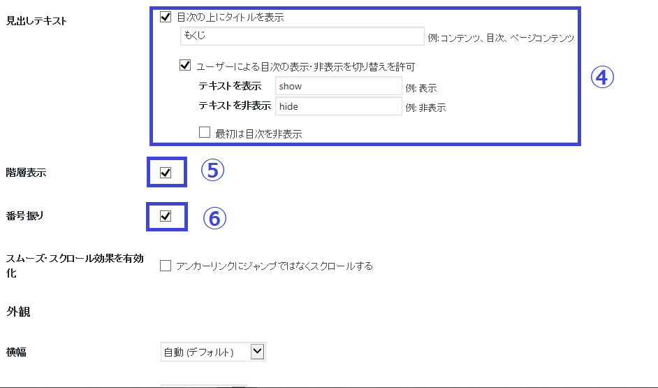 ④ 目次のタイトルと、表示・非表示の言葉の設定が出来ます。ここはあなたのお好みで設定してください。(僕の設定は以下の通りです)