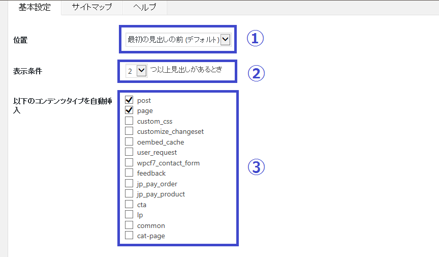 ③ 目次を表示したい記事の設定ができます。【post】(一般の投稿記事)と、【page】(固定ページ)にはチェックを入れておきましょう。