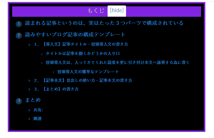 ・それぞれの見出しタグが目次に割り振られるとこの様に表示されます↓