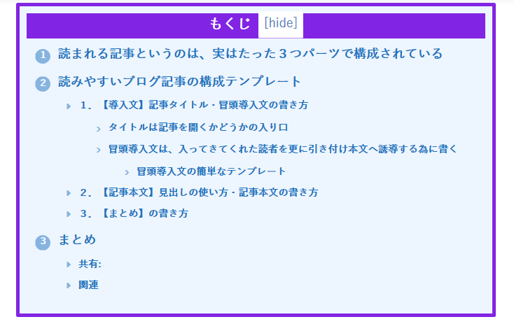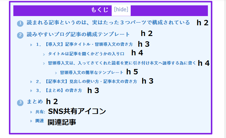 記事の見出しを【目次】として抜き出すので、見出しを付ける『順番』も意識してください。