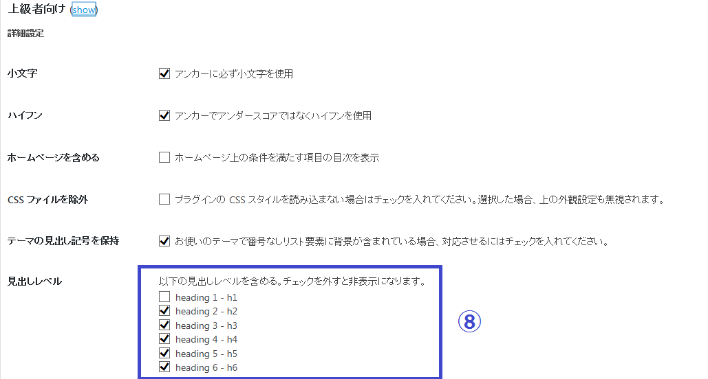 ⑧ 【見出しレベル】という項目で、どの見出しタグから目次として表示するのかを選択します。基本的には『h2』からで良いと思いますが、お使いになっているテーマによっては『h3』以降という場合もあるようですので、有料テーマの場合は確認して選択してください。