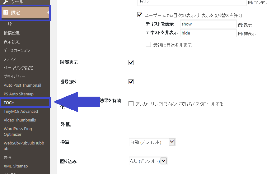 WordPressのダッシュボードから、【設定】→【TOC+】と進んでください。