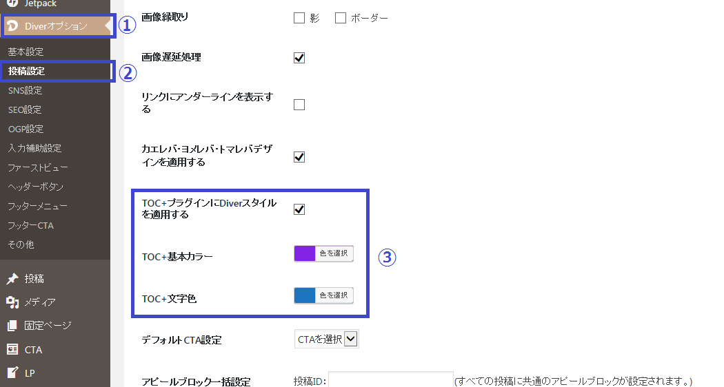 【TOC+】の設定が出来たら、ダッシュボードから、①【Diverオプション】→②【投稿設定】と進みます。