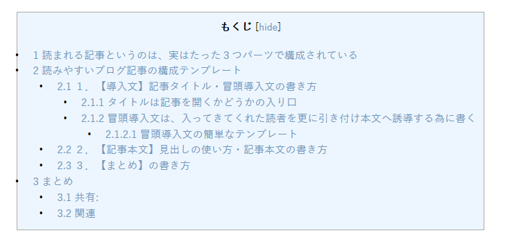 読む方からすれば、記事に何が書いてあるのかさっさと知りたいですし、「さっきの説明どこに書いてあったっけな?」という時にも目次があればすぐに分かりますよね。